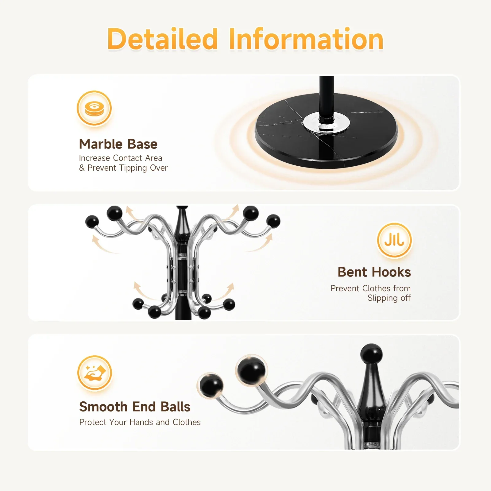66.9in Black Tree Coat Hat Rack w/ 17 Hooks, Floor Standing Umbrella Storage Stand for Bedroom Entryway, Space Saving Organizer